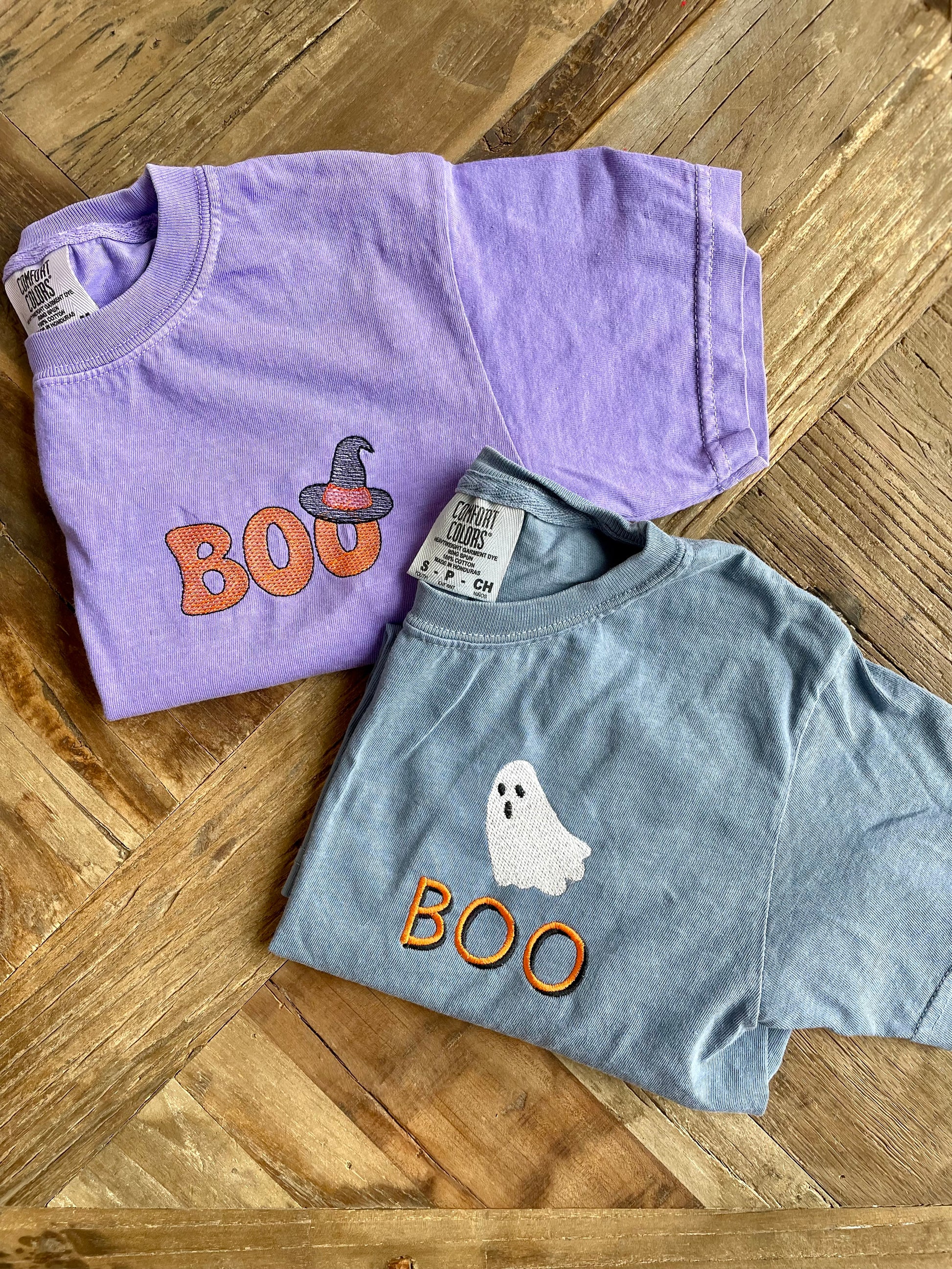 Boo!! Halloween shirts for your little ones just in time to say "trick or treat"!! Available in purple or blue. Grab yours before they're gone!