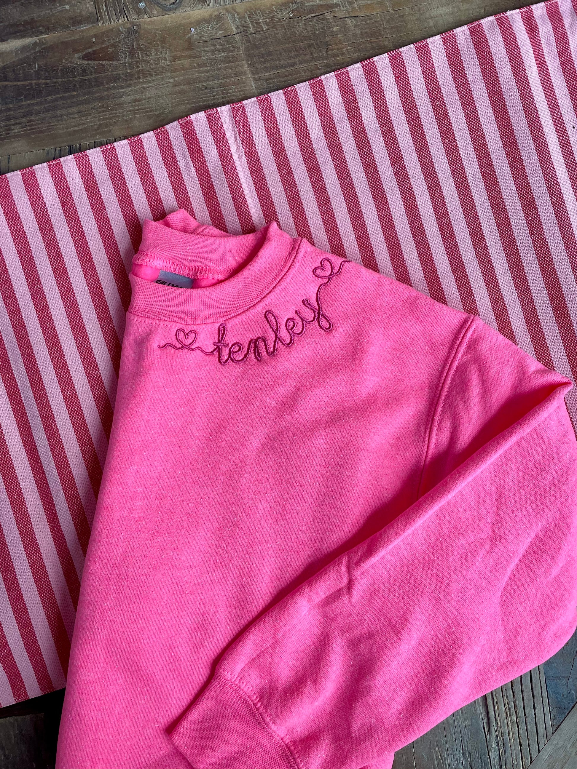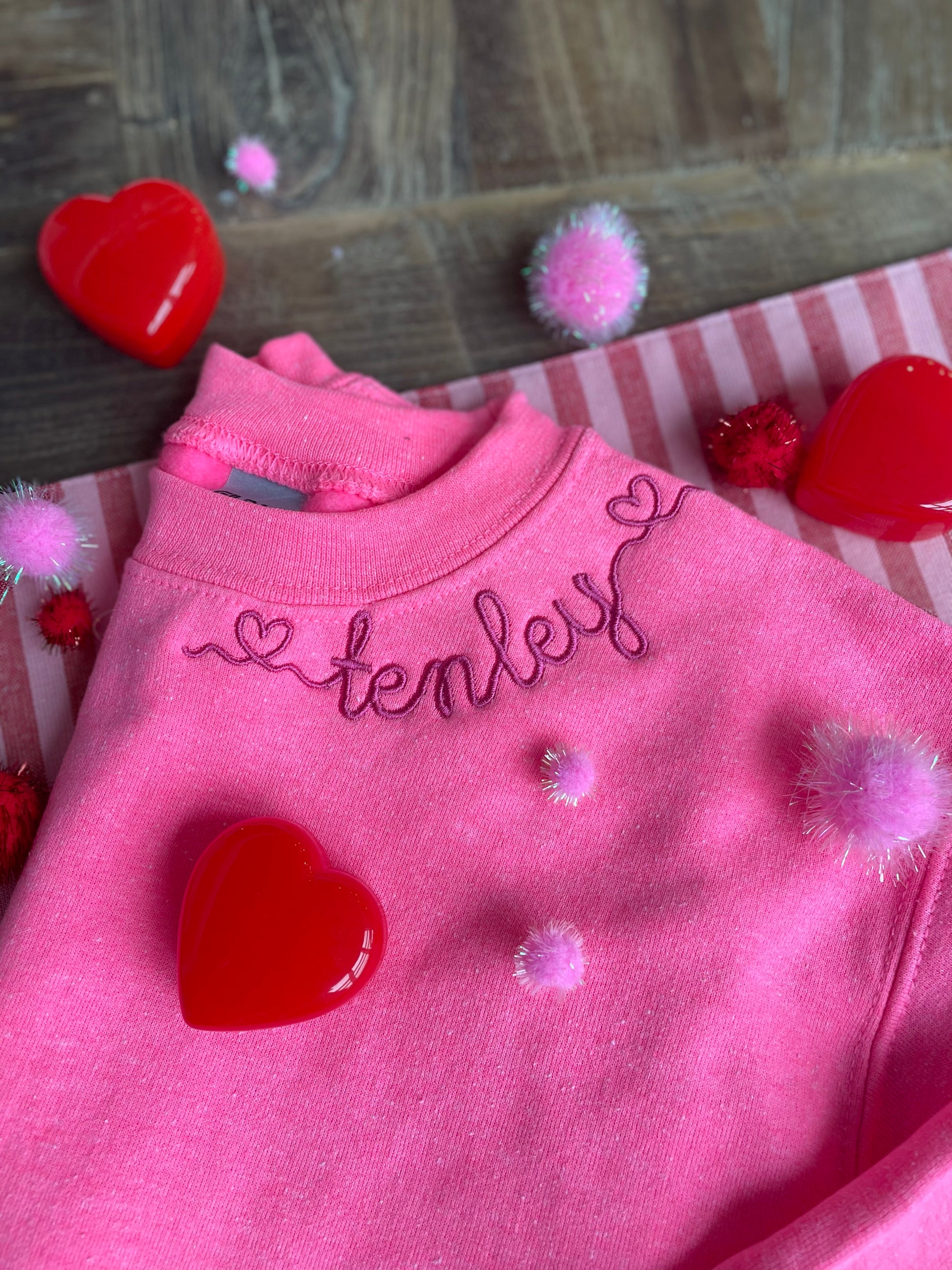 Stay warm in our neon pink neckline sweatshirt! Customized with our Mallory font, the embroidery includes heart accents on either side of her name. Perfect for Valentine's Day, but also cute for the entire chilly season!